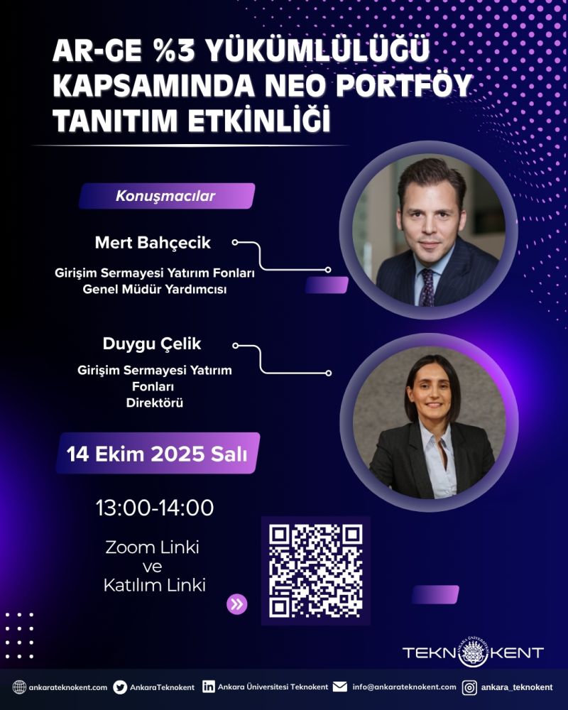 Etkinlikte, Neo Portföy’ün Ar-Ge ve Teknoloji Yatırım Fonları, destek kapsamları ve Teknokent firmalarının bu fonlardan nasıl yararlanabileceği detaylı şekilde paylaşılacaktır.