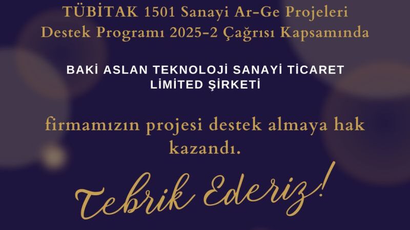 Ankara Üniversitesi Teknokent bünyesinde yer alan firmalarımızdan BAKİ ASLAN Teknoloji Sanayi Ticaret Limited Şirketi, TÜBİTAK 1501 – Sanayi Ar-Ge Projeleri Destek Programı 2025-2 Çağrısı kapsamında destek almaya hak kazanmıştır. Firmamızı tebrik ediyor, Ar-Ge yolculuğunda başarılarının devamını diliyoruz. 🚀