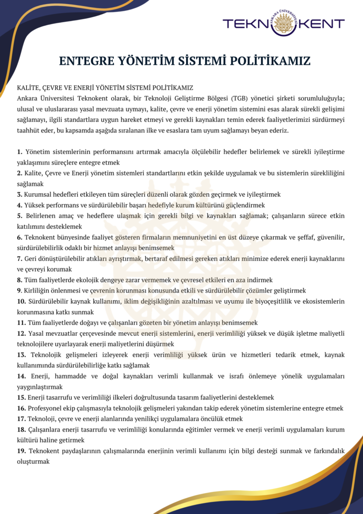 Ankara Üniversitesi Teknokent > Entegre Yönetim Sistemi Politikamız