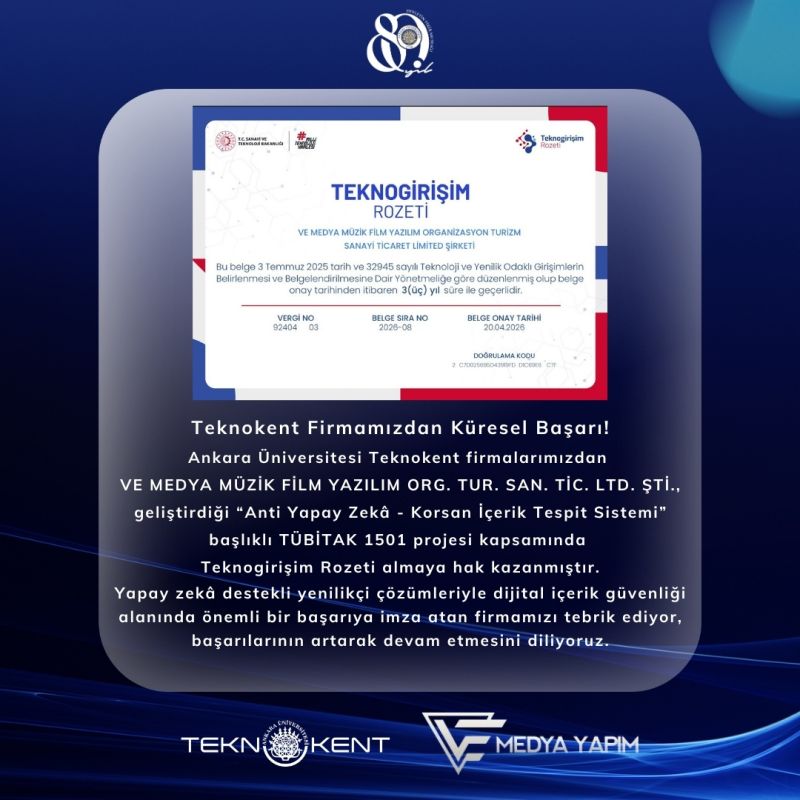 Ankara Üniversitesi Teknokent firmalarımızdan VE MEDYA MÜZİK FİLM YAZILIM ORG. TUR. SAN. TİC. LTD. ŞTİ., geliştirdiği “Anti Yapay Zekâ – Korsan İçerik Tespit Sistemi” başlıklı TÜBİTAK 1501 projesi kapsamında Teknogirişim Rozeti almaya hak kazanmıştır.